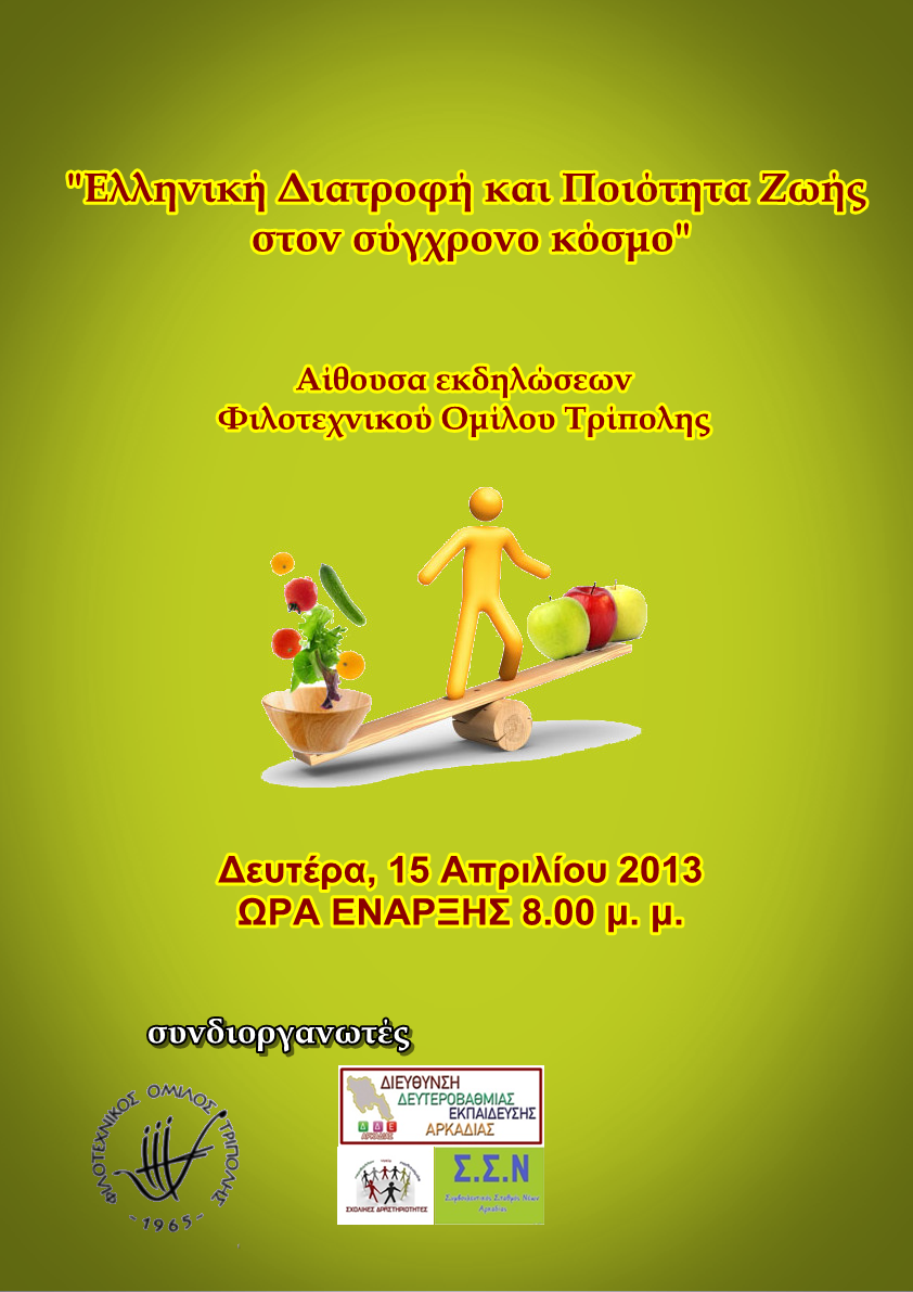 Η Διεύθυνση Δευτεροβάθμιας Εκπαίδευσης Αρκαδίας και ο Φιλοτεχνικός Όμιλος Τρίπολης έχουν την χαρά να σας προσκαλέσουν στην εκδήλωση που συνδιοργανώνουν με θέμα: «Ελληνική Διατροφή και Ποιότητα Ζωής στο σύγχρονο κόσμο», τη Δευτέρα 15 Απριλίου 2013, στις 8 μ. μ., στην αίθουσα εκδηλώσεων του Φ.Ο.Τ., Εθνομαρτύρων 25, στην Τρίπολη. Η παρουσία σας θα είναι ιδιαιτέρως τιμητική.