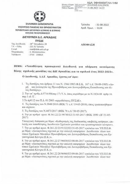 ΤΟΠΟΘΕΤΗΣΗ ΠΡΟΣΩΡΙΝΟΥ ΔΙΕΥΘΥΝΤΗ ΓΙΑ ΠΛΗΡΩΣΗ ΚΕΝΟΥΜΕΝΗΣ ΘΕΣΗΣ ΣΧΟΛΙΚΗΣ ΜΟΝΑΔΑΣ ΤΗΣ ΔΔΕ ΑΡΚΑΔΙΑΣ ΓΙΑ ΤΟ ΣΧΟΛΙΚΟ ΈΤΟΣ 2022-2023