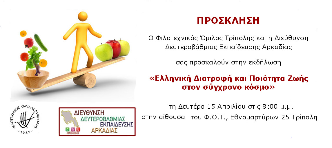 Η Διεύθυνση Δευτεροβάθμιας Εκπαίδευσης Αρκαδίας και ο Φιλοτεχνικός Όμιλος Τρίπολης έχουν την χαρά να σας προσκαλέσουν στην εκδήλωση που συνδιοργανώνουν με θέμα: «Ελληνική Διατροφή και Ποιότητα Ζωής στο σύγχρονο κόσμο», τη Δευτέρα 15 Απριλίου 2013, στις 8 μ. μ., στην αίθουσα εκδηλώσεων του Φ.Ο.Τ., Εθνομαρτύρων 25, στην Τρίπολη. Η παρουσία σας θα είναι ιδιαιτέρως τιμητική.