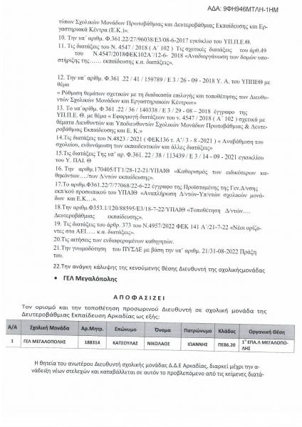 ΤΟΠΟΘΕΤΗΣΗ ΠΡΟΣΩΡΙΝΟΥ ΔΙΕΥΘΥΝΤΗ ΓΙΑ ΠΛΗΡΩΣΗ ΚΕΝΟΥΜΕΝΗΣ ΘΕΣΗΣ ΣΧΟΛΙΚΗΣ ΜΟΝΑΔΑΣ ΤΗΣ ΔΔΕ ΑΡΚΑΔΙΑΣ ΓΙΑ ΤΟ ΣΧΟΛΙΚΟ ΈΤΟΣ 2022-2023